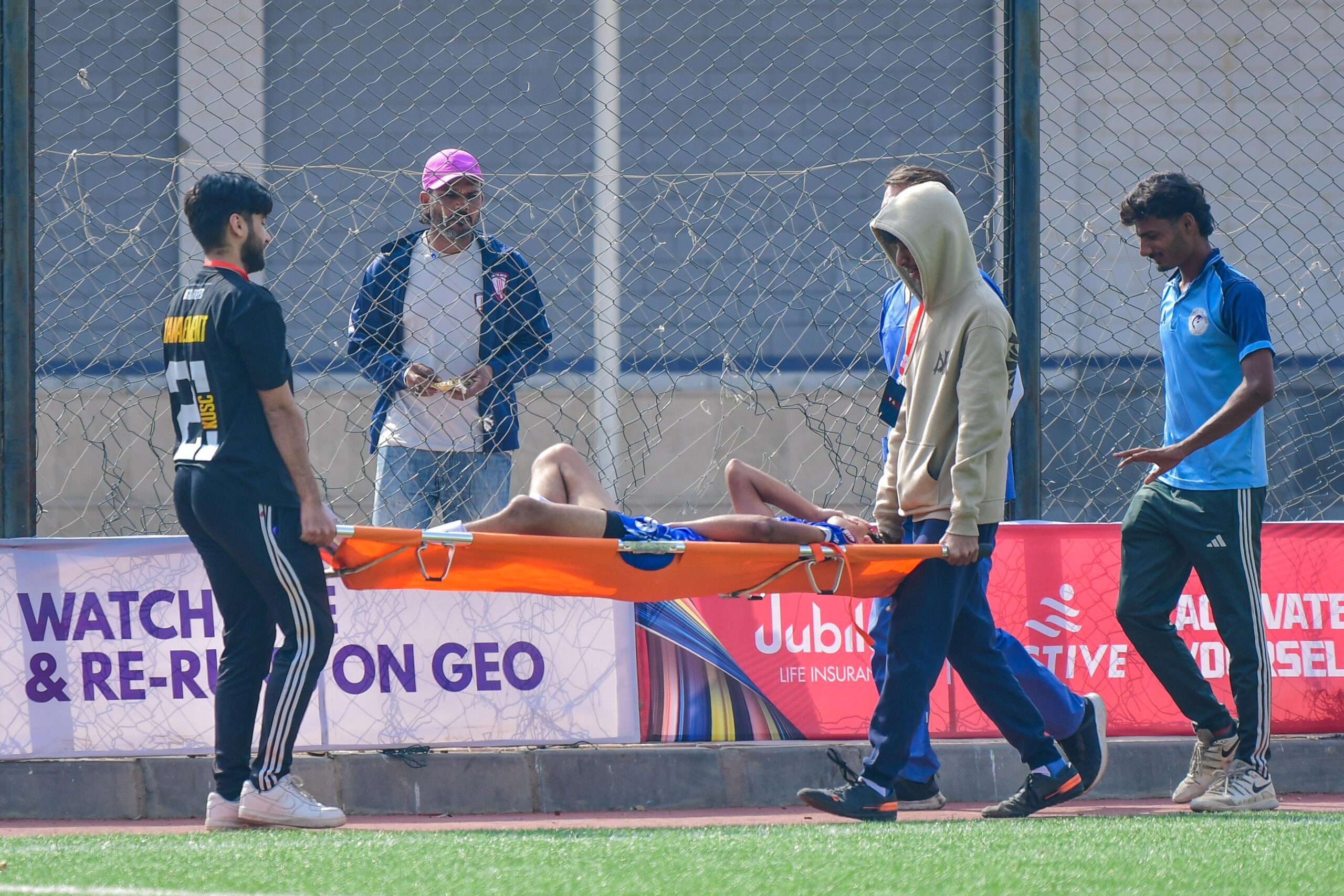 Ammar Sheikh of Whales College being stretched off after a collision with Ammar Tapal, the KGS goalkeeper.