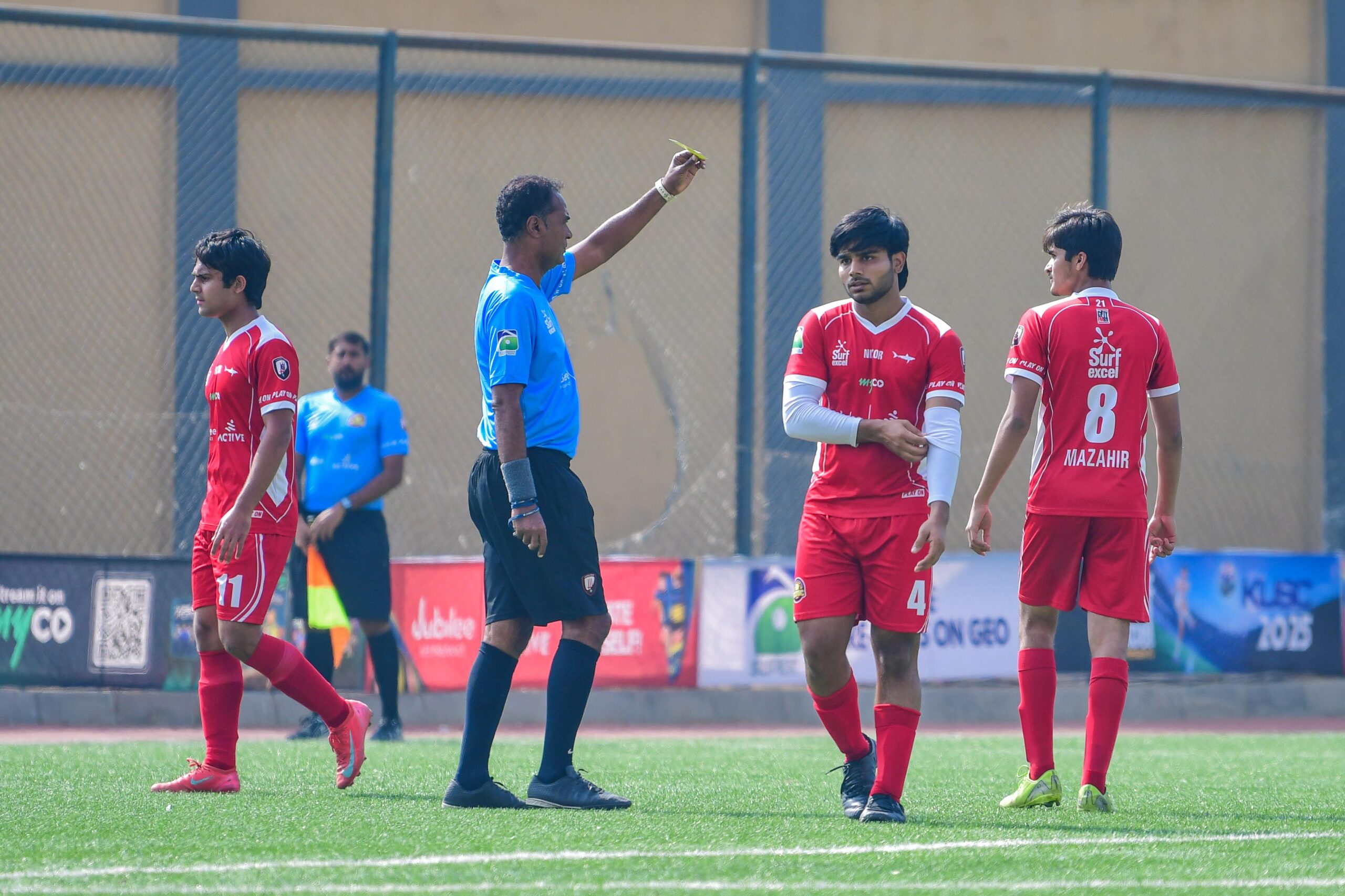 Usman Mazahir is shown the yellow card after he concedes the penalty.