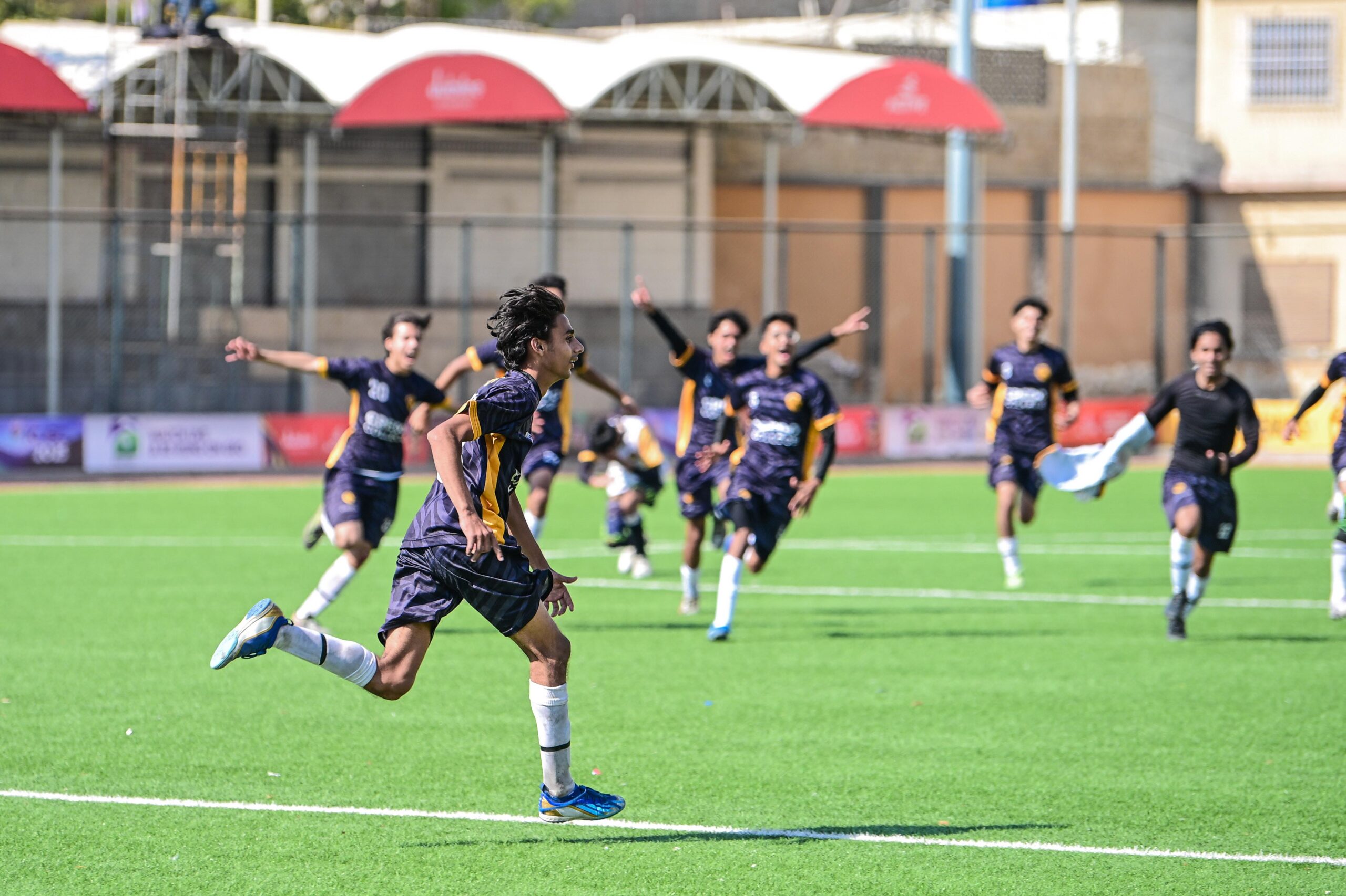 Ahmed Hussain runs off to celebrate with the team after scoring the winning penalty.